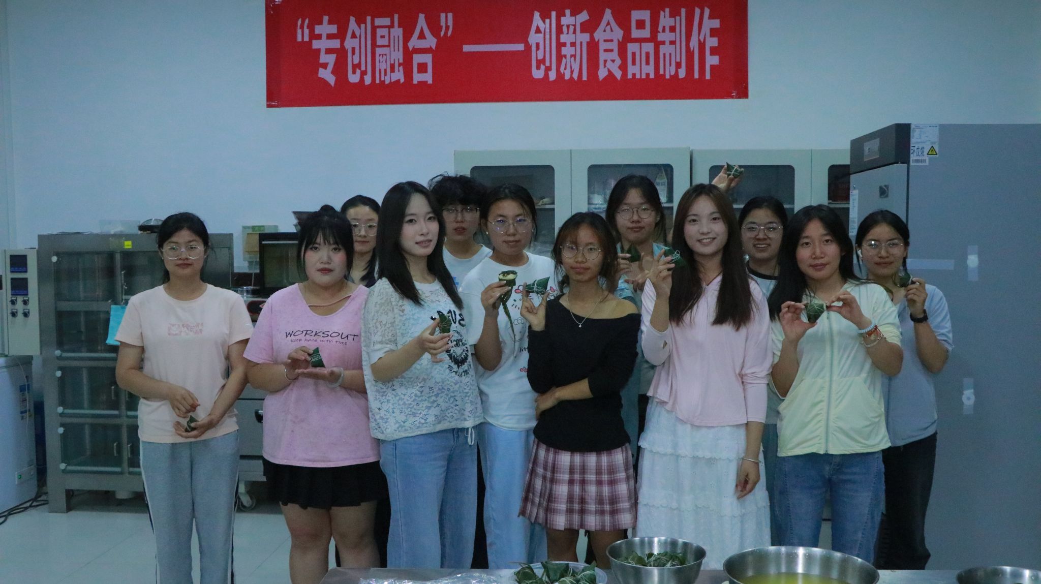 活動以屈原投江的歷史典故為引,師生們深入了解了端午節(jié)的文化意蘊(yùn)、粽子的制作淵源以及端午“驅(qū)疫避毒”的原始內(nèi)涵。實驗室內(nèi),糯米、粽葉、紅棗、豆沙等材料整齊擺放,粽葉的清香彌漫在空氣中。專業(yè)老師現(xiàn)場指導(dǎo),從選葉、折葉、填料到纏線,詳細(xì)演示了傳統(tǒng)四角粽的包制技巧。同學(xué)們圍坐一堂,邊學(xué)邊做,實驗室瞬間變成“手工課堂”。大家分工明確,互相協(xié)作,有的調(diào)餡,有的填充,有的纏線。經(jīng)過共同努力,百余個形態(tài)各異的粽子新鮮出爐。