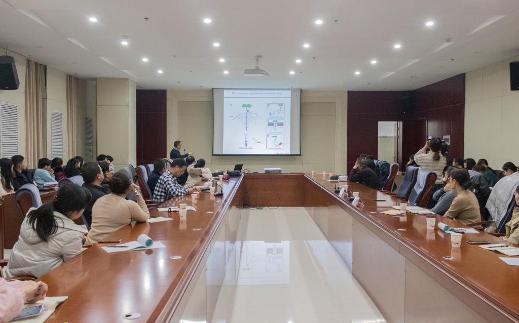 指導會上,兩位專家聽取學院發(fā)展概況匯報后,細致講解了學科和專業(yè)建設涉及的各個環(huán)節(jié)的內(nèi)容,并結合他們在河西走廊的具體項目研究作了專題輔導。晚上的學術報告會上,黎家教授就其研究領域BAK1在BR信號途徑中的重要作用、RGIs作為RGF1的受體調(diào)控植物根生長發(fā)育作用以及根的向水性機制等展開,著重講解了植物向性生長的調(diào)控機制,研究成果對培育抗旱保產(chǎn)的作物育種工作具有重要的指導作用。王鎖民教授從草類植物逆境生理與基因工程及荒漠草原恢復治理方面的研究工作和荒漠旱生植物霸王(Zygophyllum xanthoxylum)角質(zhì)層脂質(zhì)轉運蛋白編碼基因ZxABCG11轉入紫花苜蓿為專題,講解了如何對紫花苜蓿進行遺傳改良的學術報告,其研究成果對我國北方干旱、鹽漬及瘠薄的邊際土地治理及開發(fā)利用具有重要的現(xiàn)實意義。