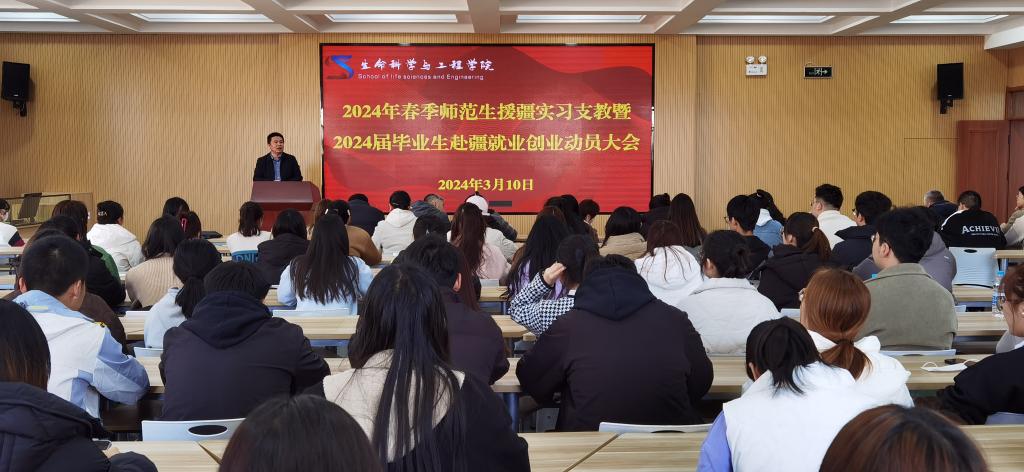 為深入落實(shí)學(xué)校“實(shí)習(xí)支教援疆計(jì)劃” “千人進(jìn)疆就業(yè)計(jì)劃”,激發(fā)生物科學(xué)師范生教育熱情,提高學(xué)生援疆實(shí)習(xí)支教意識(shí),促進(jìn)畢業(yè)生赴新疆就業(yè)創(chuàng)業(yè),3月10日,365英國上市官方網(wǎng)站召開了2024年春季師范生援疆實(shí)習(xí)支教暨2024屆畢業(yè)生赴疆就業(yè)創(chuàng)業(yè)動(dòng)員大會(huì),生物科學(xué)2021級(jí)學(xué)生和2024屆畢業(yè)生、學(xué)院班子、教研室主任、班主任200余人參加了會(huì)議。